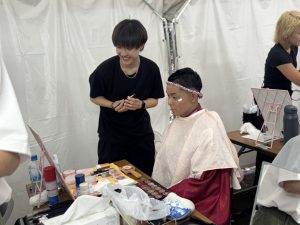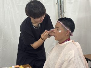 「よさこい」の現場体験です。初対面の方にメイクをすることに全く慣れておらず、最初は緊張しましたが、現場での経験を通して、今ではメイクをしながら楽しくお客様と会話ができるようになりました!