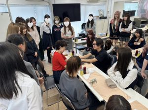 授業参観では、生徒たちが保護者の皆さんにハンドマッサージの施術を行うサロンが開催されます。